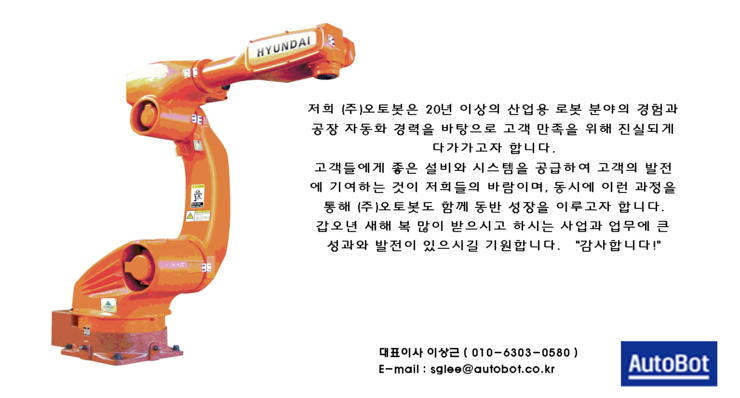 사명 ㈜오토봇 / AutoBot Co., Ltd. 대표이사 이상근 업태 제조업, 서비스업 종목 산업용 로봇시스템 제조, 설치 및 시운전, 자동화설비 제 조 및 설치, 로봇 티칭 대표전화번호 031-477-0365 팩스번호 031-431-0364 e-mail sglee@autobot.co.kr 사업장 주소 경기도 안산시 단원구 동산로 76, 216호 (원시동,타원 TAKRA2 지식산업센타) 주요 제품(상품, 서비스) 산업용 로봇시스템 제작, 설치 및 시운전, OLP, 로봇 엔지니어링 시스템 구성품 산업용 로봇, 공업기기, PLC, Jig & Fixture 등 주요 적용 분야 용접, 핸들링, 팔레타이징, 프레스 링킹, 실링, 가공, 레이저 응용, 비전 및 검사, 취출, 디버링 등